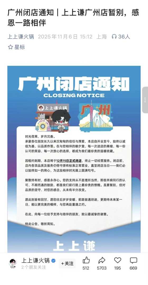 歌手薛之谦创立的火锅品牌上上谦再度收缩业务版图。近日,上上谦火锅微信公众号发布一则“广州闭店通知”称,上上谦广州店因租约到期,将于12月15日正式闭店,终止一切经营服务,餐饮市场再起波澜。据商业视界分析,明星餐饮扩张潮正面临退潮考验。