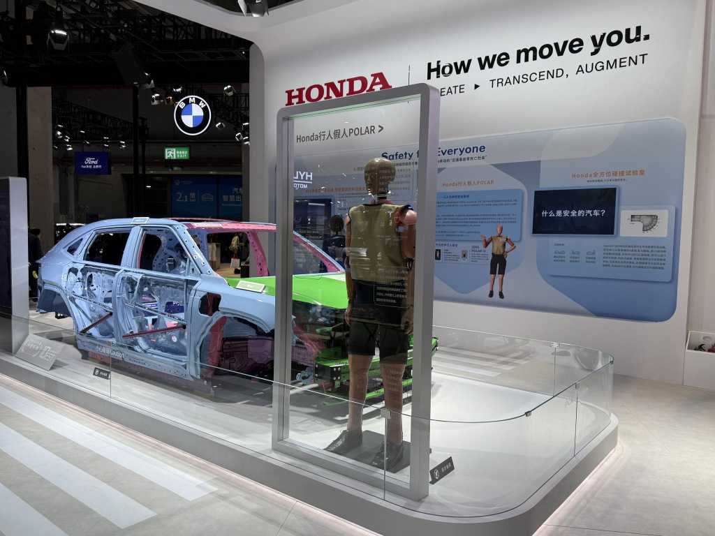 在被动安全方面,本届进博会上,车企们亮出的技术系统性地聚焦于车身结构的刚性升级与碰撞伤害的精准控制。日本车企本田汽车不仅把切割开的白车身放到了展台“C位”,还带来了碰撞测试假人技术的详解。展台工作人员介绍,本田从“共存安全”理念出发研制的ACE承载式车身构造,是一种在保护自己的同时还能降低对方冲击力的安全技术,实现双向车辆的安全保护。这款结构件采用68%高强度钢与25%航空航天级热成型钢(强度达 1500MPa),车身扭转刚性达到4万牛米/度。另外,据介绍,作为纯电车型专属骨架,其针对电池包区域强化了周边框架刚性,通过三路径传力吸能结构减少碰撞挤压风险,目前已全系搭载于东风本田S7量产车型。
