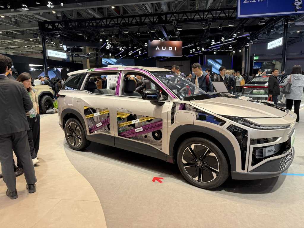 在另一日本汽车巨头丰田的展台上,铂智3X切割车也吸引了观众的目光。丰田方面强调,品牌对“安全安心”的坚守,始终是高于一切的核心准则。希望在进博会上不仅对技术进行展示,更展现出安全承诺。展台工作人员表示,该款展车的车身中,高强度钢、超高强度钢、热成型钢材料占比高达72%,尤其是其热成型一体式车身+362多通道传力结构,可在发生意外时保证乘员舱完整和侧面生存空间。更重要的是,抗冲击的车身可防止碰撞冲击导致的电芯变形以及后续的电池包起火风险。