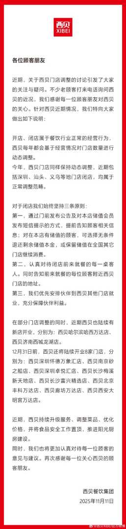 11月11日,西贝发布声明回应门店调整讨论,称开店闭店属正常经营行为。今年西贝门店动态调整,部分闭店同时新店开业,展现持续发展活力。