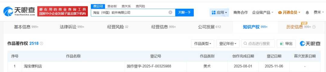 南方财经11月11日电,天眼查知识产权信息显示,近日,淘宝(中国)软件有限公司登记淘宝便利店作品著作权,作品类别为美术。在零售领域,这一动作标志着淘宝正式进军便利店市场,淘宝便利店的推出,无疑将为消费者带来更多便利选择。值得一提的是,今年,阿里巴巴(中国)有限公司已申请注册淘宝便利店商标,国际分类涉及广告销售、皮革皮具,当前商标状态为等待实质审查。据媒体报道,10月31日,淘宝闪购正式发布全新连锁便利品牌淘宝便利店,该品牌于11月1日正式面向消费者上线,预示着零售新格局的开启。