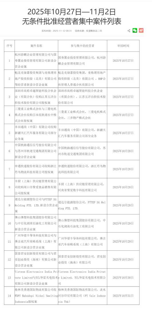 市场监管总局11月12日发布2025年10月27日—11月2日无条件批准经营者集中案件列表,涵盖丰田通商收购新疆天汇部分业务案等,体现严格监管与市场公平竞争。