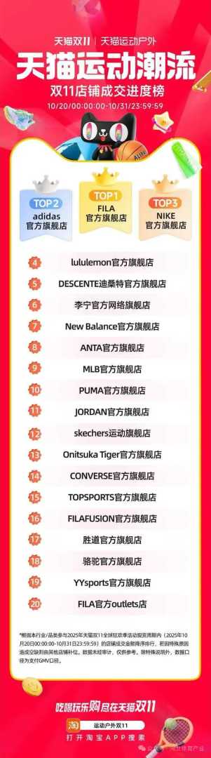 据第三方电商数据机构久谦中台发布的《双11大促首阶段分析》报告,2025年双十一期间,运动户外行业(户外消费)保持爆发式增长,天猫正式开卖后,斐乐、耐克、lululemon成交快速破亿,彰显强劲市场活力。