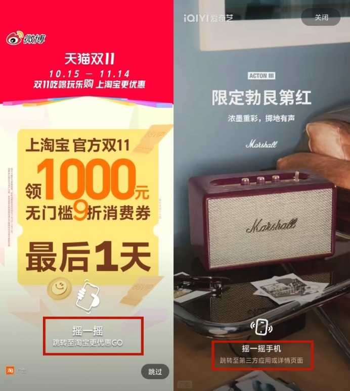 不过,红星资本局在此次实测中发现:有App仍存在“摇一摇”跳转的广告。其中,微博和爱奇艺的开屏广告跳转方式均为“摇一摇”跳转,这种违规广告形式亟待整治。