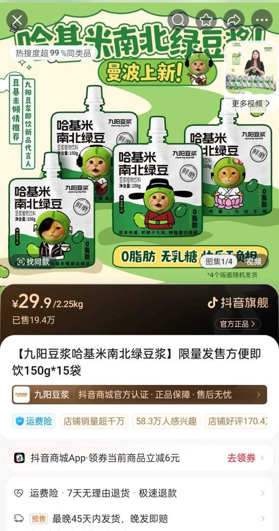 商品详情页面显示,九阳豆浆的这款产品名称为“哈基米南北绿豆豆浆植物饮料”,配料为大豆、绿豆、水、白砂糖、冰糖。15袋售价29.9元,已售19.4万单,由于购买量过大已无现货,目前处于预售状态,最晚45天内发货。这款豆浆凭借独特口味和营销,迅速走红市场。
