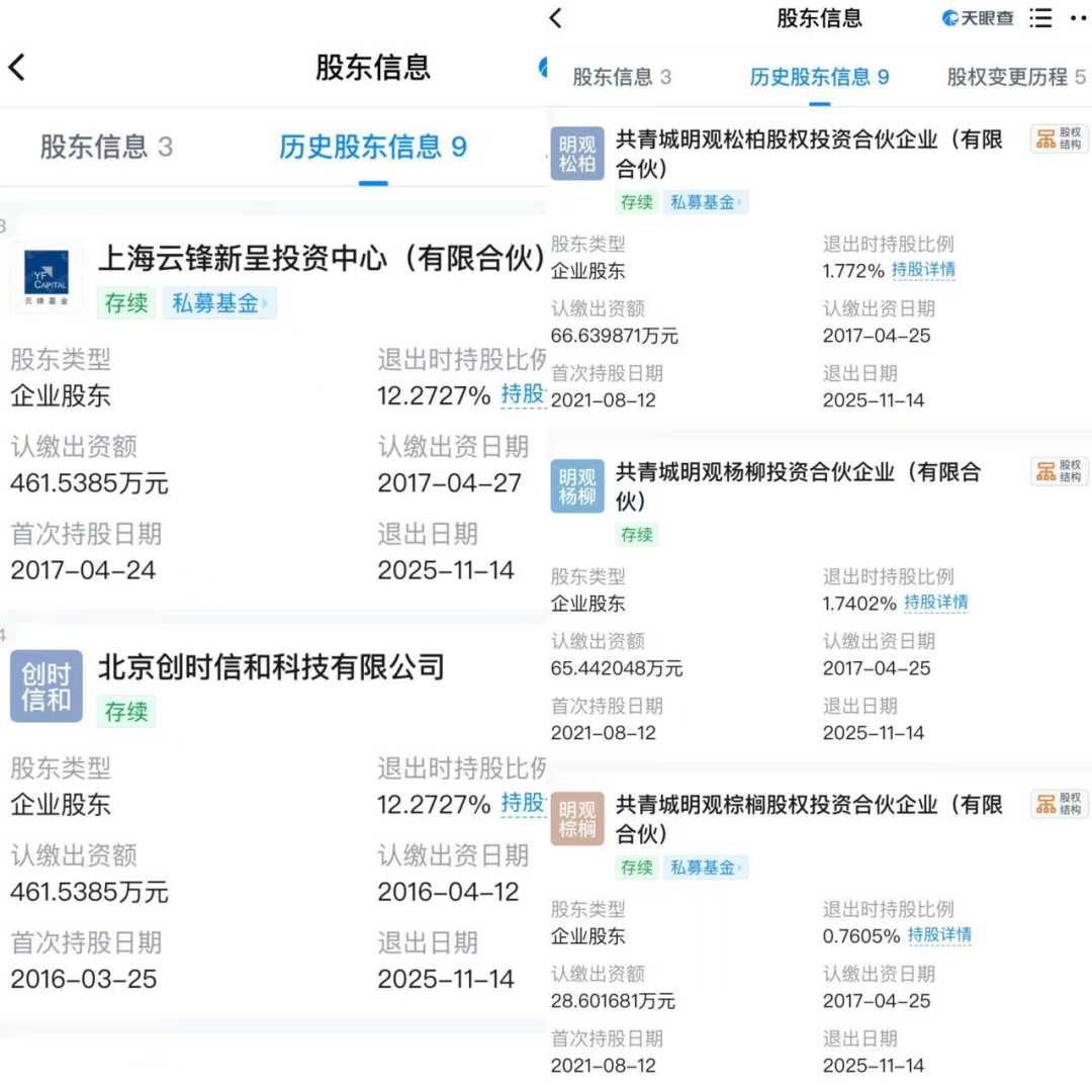 天眼查工商信息显示,11月14日,共有多家企业、私募基金退出天津银河酷娱文化传媒有限公司股东行列,这一变动引发了市场对娱乐传媒行业的关注。同时,部分主要人员也发生变更,显示出公司内部结构的调整。其中,上海云锋新呈投资中心(有限合伙)、北京创时信和科技有限公司退出,退出时持股比例均为12.2727%,认缴出资额均为461万余元;共青城明观杨柳股权投资合伙企业(有限合伙)退出时持股比例为1.7402%,认缴出资额为65.44万余元;共青城明观棕榈股权投资合伙企业(有限合伙)退出时持股比例为0.7605%,认缴出资额为28.6万余元;共青城明观松柏股权投资合伙企业(有限合伙)退出时持股比例为1.772%,认缴出资额为66.63万余元。