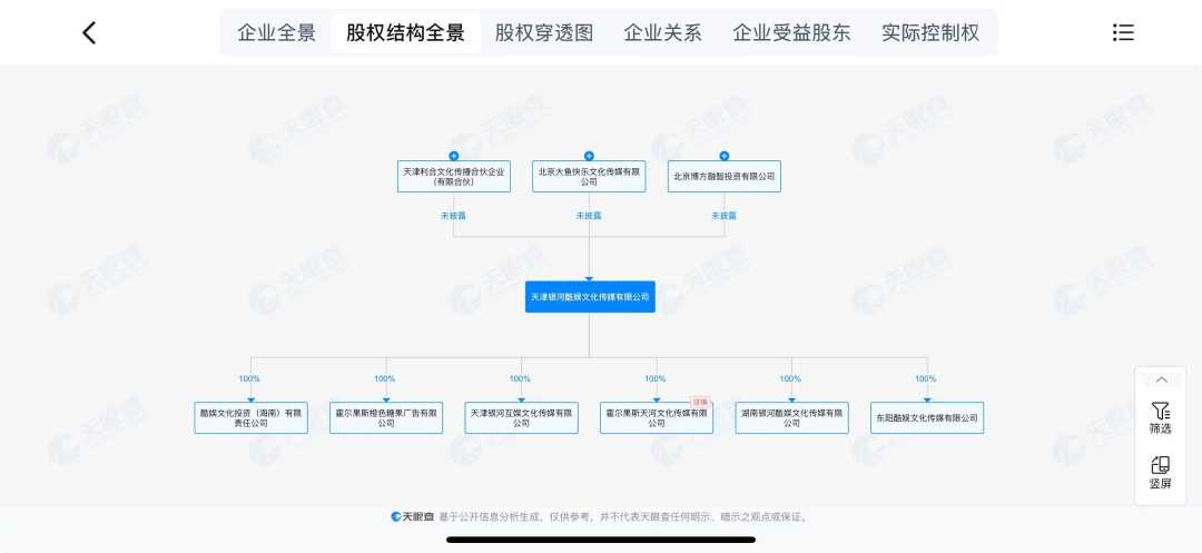 天眼查APP显示,天津银河酷娱文化传媒有限公司成立于2015年,法定代表人为吴晓珍,注册资本3760多万元;此前公司股东共有8家,目前还有三家股东,但持股比例未披露。其中,股东之一北京大鱼快乐文化传媒有限公司由虎鲸文化娱乐(北京)有限公司100%持股,后者前身为阿里巴巴文化娱乐有限公司。而此次退出的股东上海云锋新呈投资中心(有限合伙)背后的云锋基金与“阿里系”公司的关系也很密切。