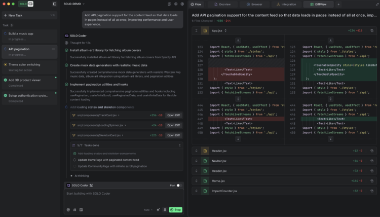 全新可视化布局,支持多任务并行,让 AI 开发更简便、可控。SOLO正式版提供了三栏布局,从左到右分别为多任务列表、对话流窗口和工具面板,致力于为用户打造更清晰、高效的开发空间。多任务列表为SOLO正式版新增功能,支持同时并行开发不同功能模块。开发者可以多线程推进工作,并在多个任务之间灵活切换,清晰掌握每个任务的实时进度,有效提升开发效率,让编程工作更加得心应手。