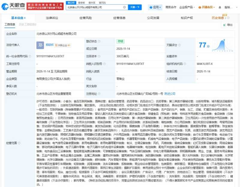 北京房山沃尔玛山姆超市成立,注册资本300万美元