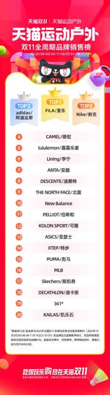 运动市场洗牌正在明显加剧,本土化运营成为关键因素。天猫数据显示,在今年双十一运动户外全周期成交榜中,FILA排名第一,阿迪达斯排名第二,耐克排名第三。近年来,这是耐克首次跌落榜首。在今年排名中,骆驼、lululemon、李宁、安踏、迪桑特、北面、New Balance依次占据了4—10名,凸显了市场竞争的激烈程度。