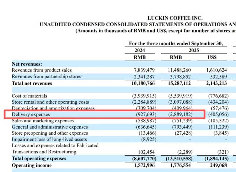 瑞幸是中国第一大咖啡品牌,截至第三季度末门店总数已攀升至29214家,其中自营门店18882家、联营门店10332家,单季度净增3008家。凭借庞大的门店网络和稳定的运营能力,瑞幸成为今年夏天各平台“外卖补贴战”冲单的重点合作品牌之一。瑞幸董事长黎辉在近期采访中透露,公司加快了与外卖平台合作的步伐,从第三方平台来的流量和客户所占比例较此前大大提高。这助力公司各项指标取得亮眼成绩,第三季度,公司GMV同比增长48.1%至173.2亿元;月均交易客户数达1.12亿人,同比增长40.6%。不过,瑞幸并没有在这个巨大的流量池中赚到更多钱,更像是“赚吆喝”,第三季度其在营收环比增加近30亿元的情况下,利润较上季度却几乎持平。外卖订单的激增还导致公司运营成本出现结构性变化——单季度瑞幸配送费达28.89亿元,同比暴涨211.4%,较上年同期多出近20亿元,该成本占总营收的比例从9%攀升至18.9%,几乎吞噬了利润空间。
