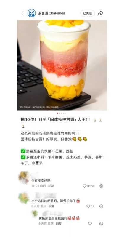 不少网友还去各大新茶饮品牌的评论区“许愿”,盼着能出“官方版”固体杨枝甘露。以茶百道为例,11月5日,品牌通过社交账号“官方接梗”,发布教程指导消费者用门店小料复刻这款甜品,评论区随即被“求上架”的声音刷屏,有网友留言:“别逼我求你,赶紧出个官方版!”