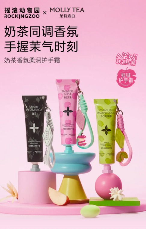 更早之前的2025年8月,新锐个护品牌摇滚动物园,携手奶茶品牌茉莉奶白,推出联名挂链式护手霜,有“白兰”、“针王苹果”、“开心果茉莉椰”三款香型。