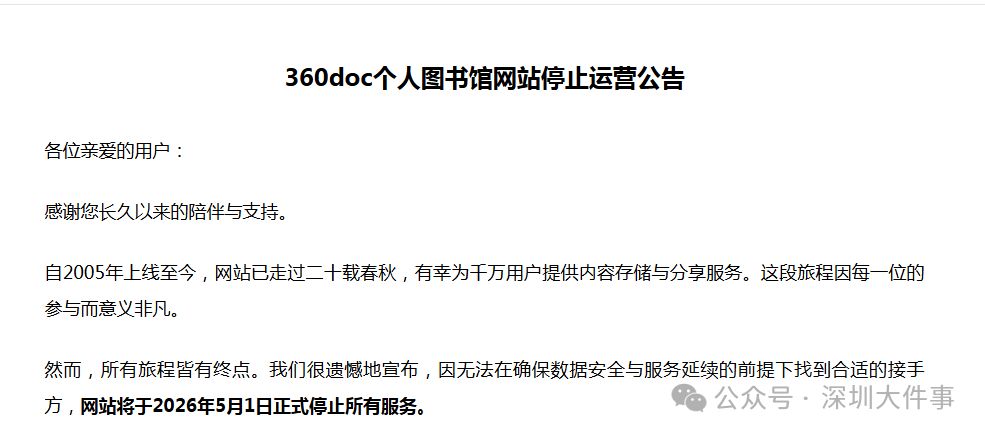 停止运营公告显示,因无法在确保数据安全与服务延续的前提下找到合适的接手方,网站将于2026年5月1日正式停止所有服务。即日起,360doc个人图书馆网站暂停新内容发布,但登录、数据备份、VIP退费申请、钱包提现功能均正常开放。