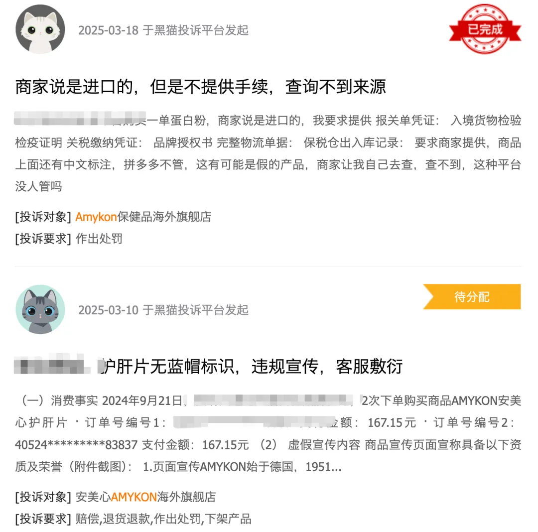 记者查询发现,有相关情况的投诉不在少数,在黑猫投诉平台上,输入AMYKON可以看到大量投诉,其中大多为功效、品牌、产地等方面存在虚假宣传的问题。