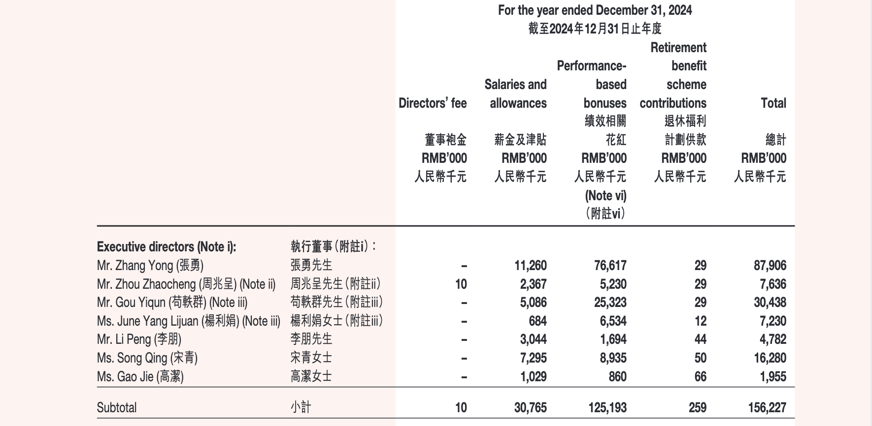 即便如此,张勇为首的管理层薪资仍然大幅增长。2024年,7名执行董事包含花红在内的薪金总计1.6亿元,比2021年的5966万元增长了约1.7倍。