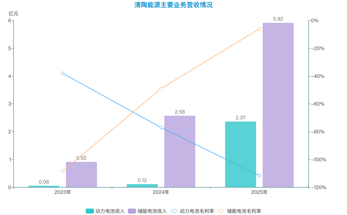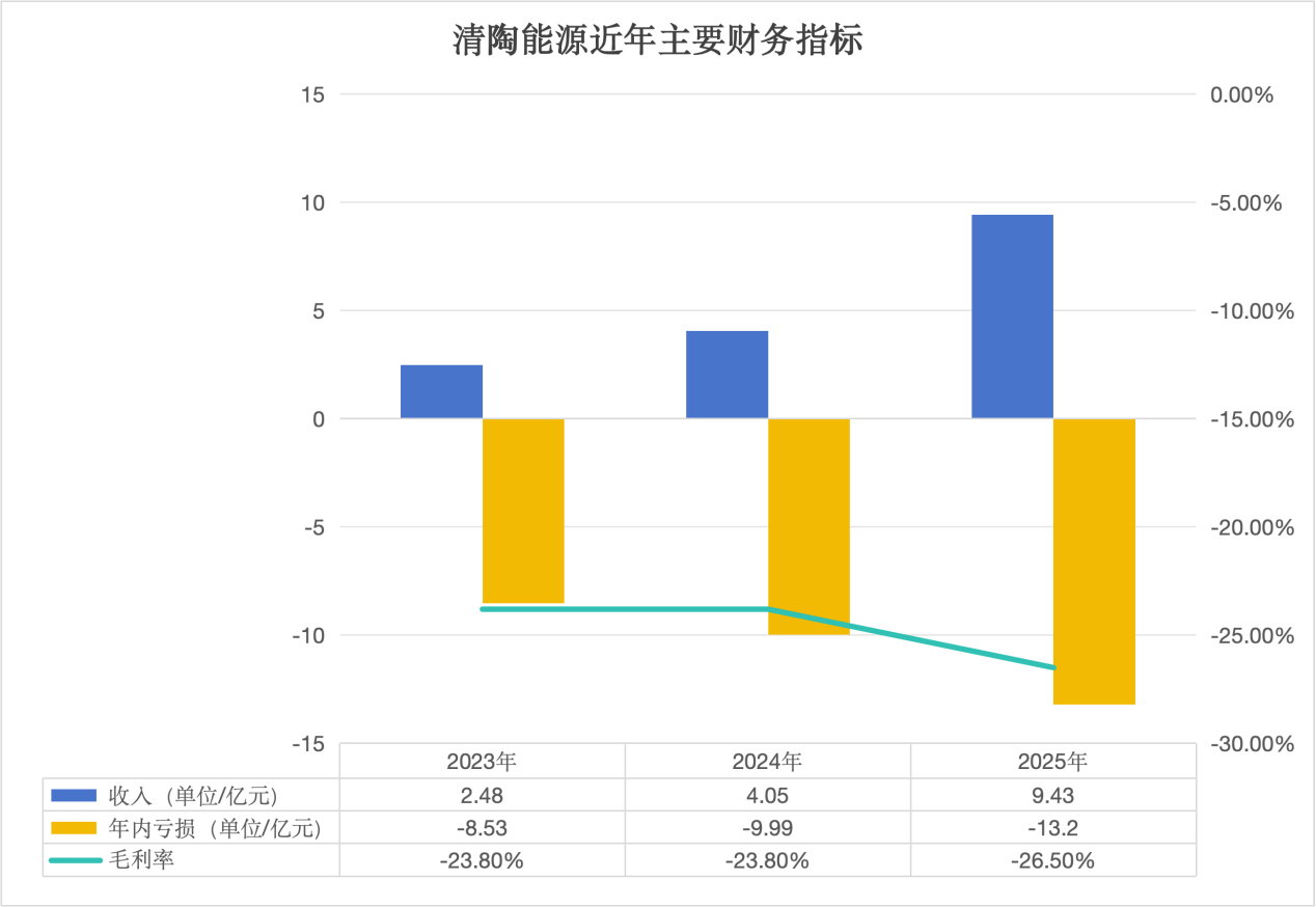 不过,清陶能源的电池生意还未尝到甜头。2023年至2025年,清陶能源净亏损合计达到31.54亿元,公司动力电池与储能电池的毛利率均为负,而且动力电池“越卖越亏”,2025年毛利率已低于-110%。