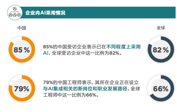 在中国,85%的受访企业已不同程度采用AI,超过全球82%的平均水平;同时,74%的企业将成本列为AI应用的首要顾虑,而去年的焦点还是监管与道德。