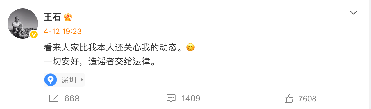 4月12日,有网络消息称“王石被抓”,并有一系列如“因万科经营亏损被追责”“失联涉刑”等消息同步发酵,王石与其妻子田朴珺先后就此辟谣,王石同时表示,“一切安好,造谣者交给法律”。