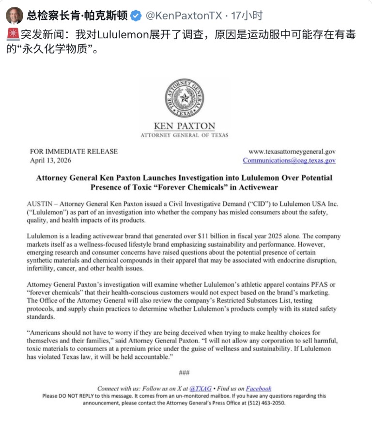 “美国人不应该在为自己和家人选择健康生活方式时,还要担心是否被欺骗,”Paxton表示。“我不会允许任何企业以健康与可持续性为幌子,向消费者高价销售有害、有毒的材料。如果露露乐蒙违反了得克萨斯州法律,它将被追究责任。”
