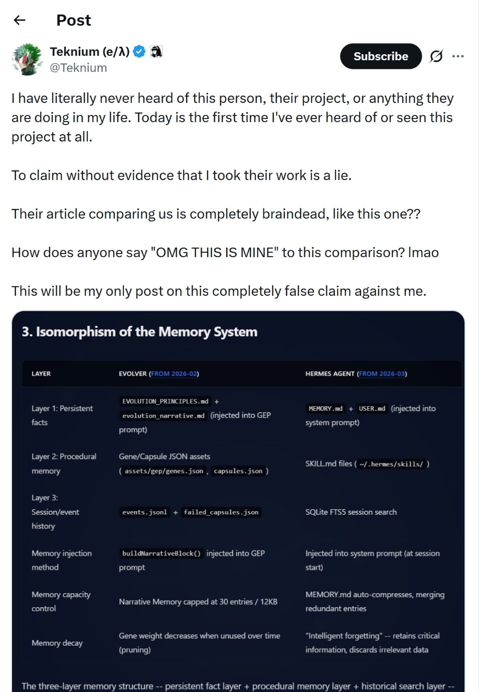 不过,15日晚间,Nous Research联合创始人Teknium做了又一次回应,“我从来没有听说过这个人、他的项目,今天是我第一次听说或看到这个项目。毫无证据地声称我剽窃了他们的作品,这是谎言。”