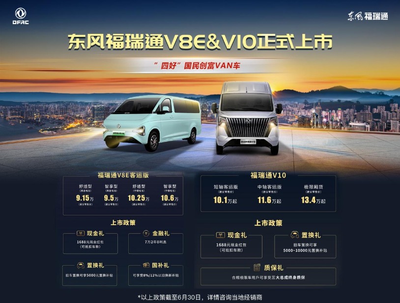 根据东风股份营销总部副总部长、福瑞通事业部总经理郭全宾发布的东风福瑞通V8E、V10两款车型建议零售价,东风福瑞通V8E客运版售价9.15万—10.6万元,东风福瑞通V10售价10.1万起—13.4万起,并同步推出了现金礼、置换礼等上市政策。