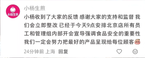 4月16日上午,小杨生煎官方账号在帖子下回复,称收到了反馈,会立即整改,已经于今天(4月16日)9点安排北京店所有员工和管理组内部开会,强调食品安全的重要性。
