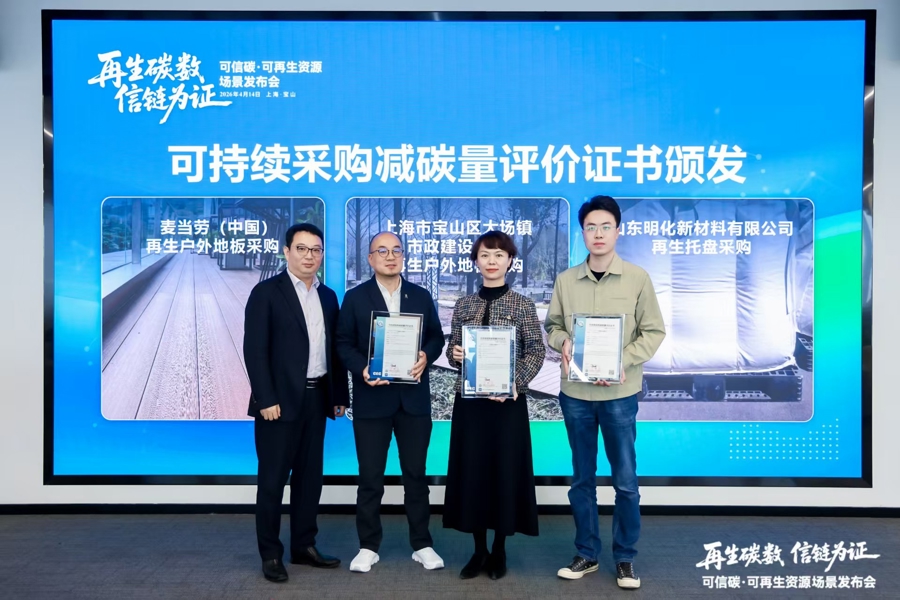 活动现场还举行了全国首批可再生资源碳数字身份证以及可持续减碳量评价证书颁发仪式。山东佳纳环保、浙江仁川节能环保获颁废纺再生行业首批碳数字身份证;上海市宝山区大场镇市政建设公司、金拱门(中国)有限公司以及山东明化新材料有限公司获颁可持续减碳量评价证书。依托可信碳信息网与息壤可再生资源可信碳服务平台,这些项目实现了废纺再生产品碳数据全生命周期追溯与可信披露,从生产端到消纳端全链条区块链留痕,为采购方生成专属碳资产凭证——真正将每一笔绿色采购行为,转化为可量化、可核查、可流通的碳资产。