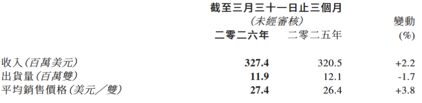 4月16日,九兴控股(01836)发布公告,2026年第一季度,公司综合收入同比增长约1.9%至3.37亿美元,2025年同期综合收入约为3.31亿美元。公司鞋履制造业务具体数据如下: