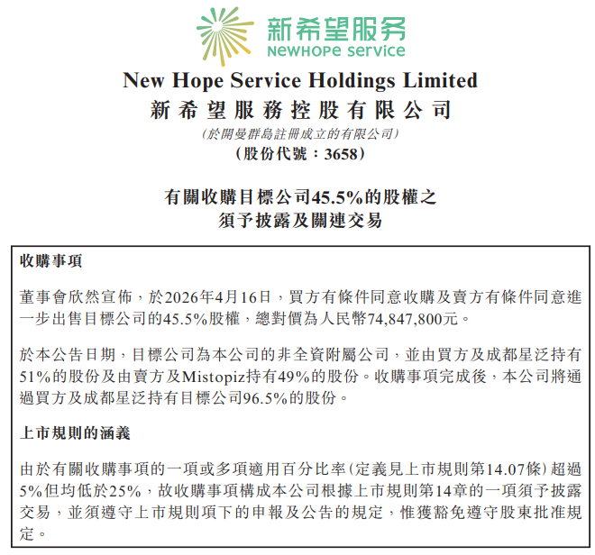 4月17日,刘永好家族旗下港股公司——新希望服务(03658.HK)发布公告,董事会欣然宣布,于2026年4月16日,公司有条件同意收购及卖方有条件同意进一步出售目标公司成都明宇环球商业管理有限公司(以下简称:明宇环球商业)的45.5