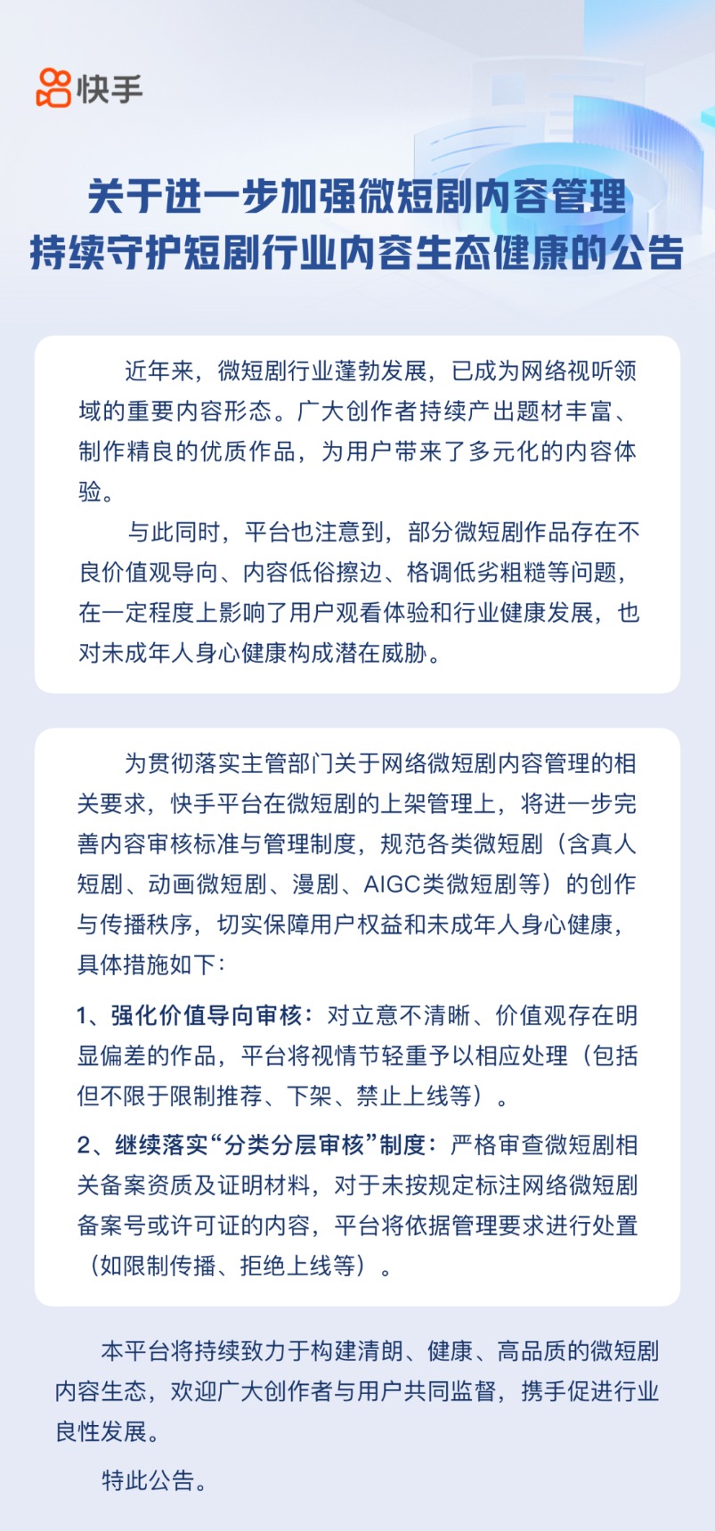 4月17日,快手发布关于进一步加强微短剧内容管理、持续守护短剧行业内容生态健康的公告,称将进一步完善内容审核标准与管理制度,规范各类微短剧(含真人短剧、动画微短剧、漫剧、AIGC类微短剧等)的创作与传播秩序,切实