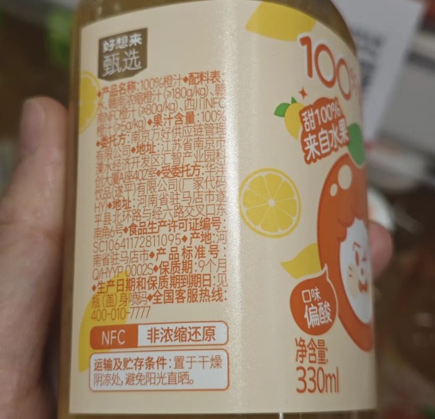 以“好想来甄选100%橙汁”为例,其配料表显示:不少于180g/kg的赣南浓缩橙汁、不少于80g/kg的赣南NFC橙汁、不少于5g/kg的四川NFC橙汁。