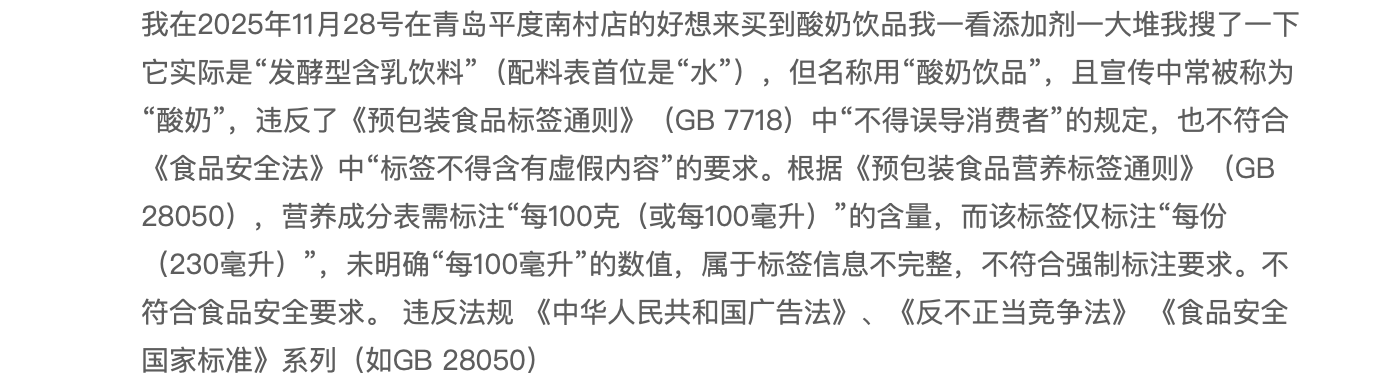 此前,好想来在售的“酸奶饮品”并不含有酸奶也引发争议。有消费者在黑猫投诉平台上质疑好想来售卖的另一款标注“0蔗糖”的230ml宝宝草莓酸奶饮品,实际上并非酸奶而是“发酵型含乳饮料”,其配料表首位是水。