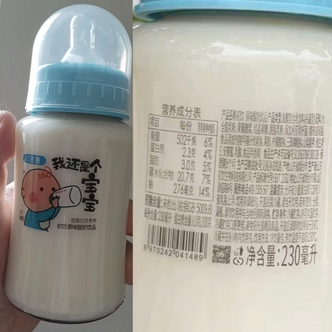 “初饮原味酸奶饮品”配料表为水、全脂乳粉、果葡糖浆、结晶果糖、脱脂乳粉、保加利亚乳杆菌、以及多种食品添加剂。饮品却是“0蔗糖”,但是含有果葡萄糖以及果糖。
