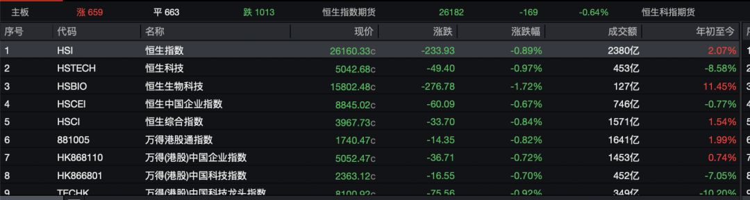 4月17日,港股三大指数集体下跌。其中,恒生指数报收于26160.33点,跌0.89%;恒生科技指数报收于5042.68点,跌0.97%;恒生中国企业指数报收