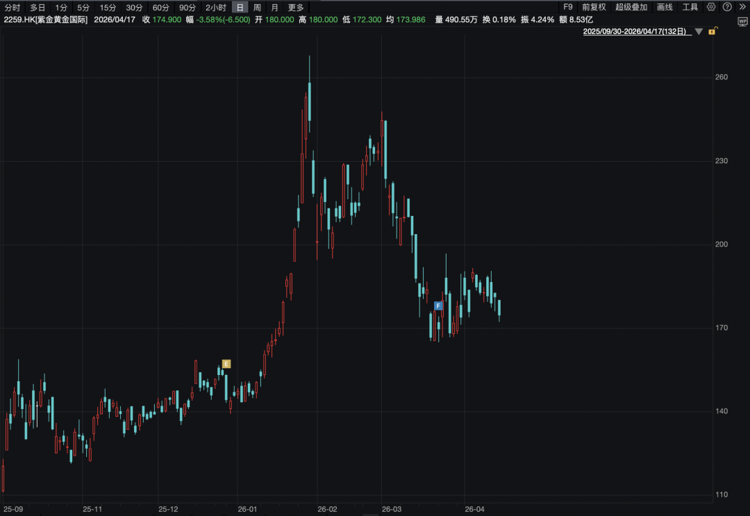 黄金板块今日调整。其中,灵宝黄金跌4.59%,紫金黄金国际跌3.58%,老铺黄金跌3.51%,贵金属相关股集体降温。