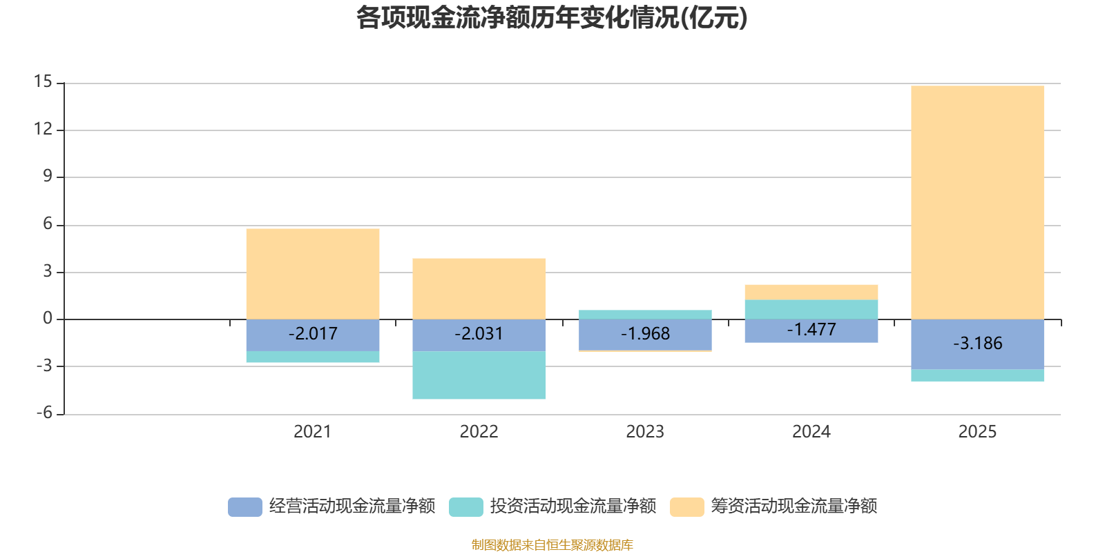 2025年,公司经营活动现金流净额为-3.19亿元,同比减少1.71亿元;筹资活动现金流净额14.81亿元,同比增加13.87亿元;投资活动现金流净额-7532.1万元,上年同期为1.25亿元。