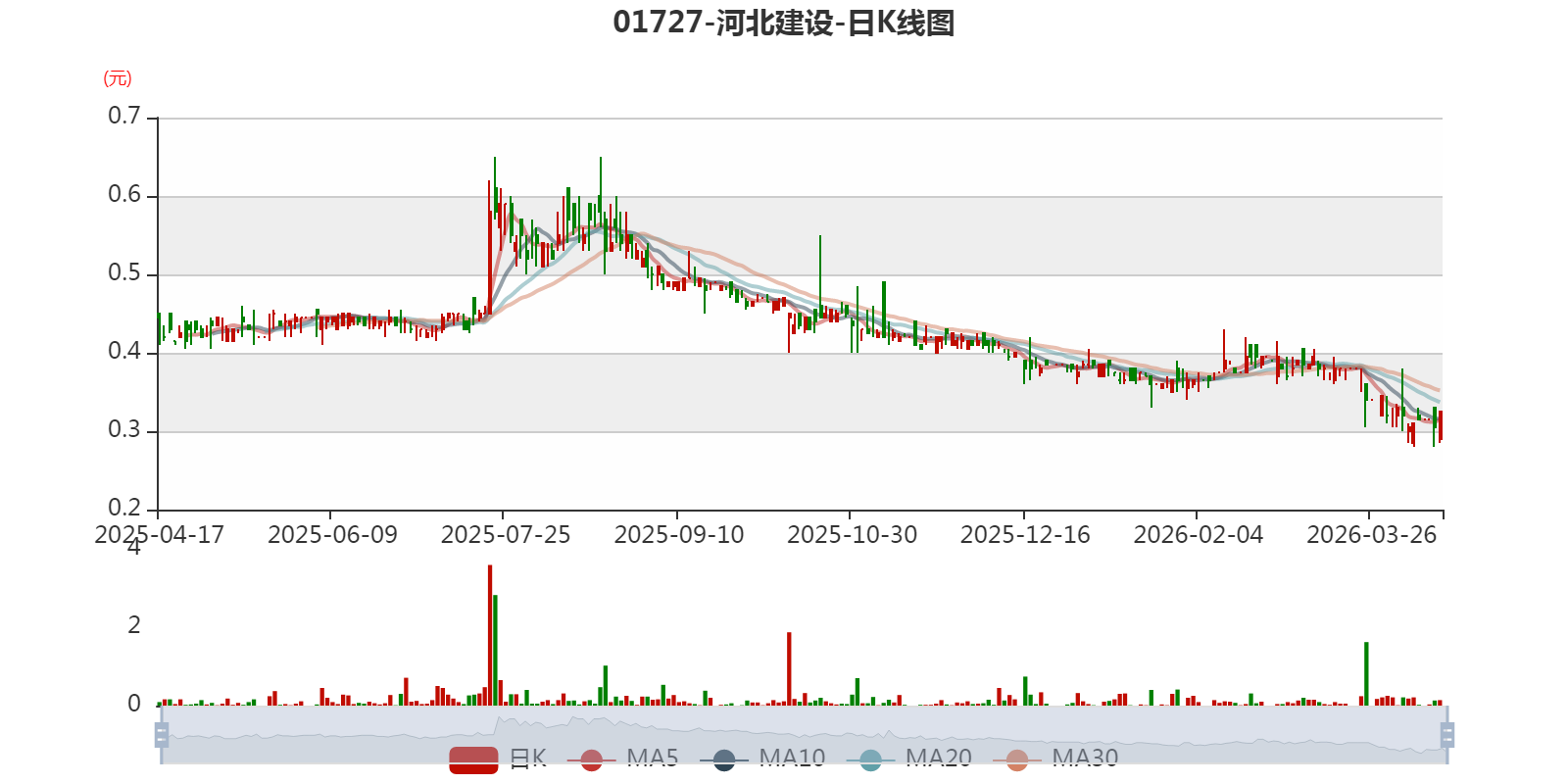 中证智能财讯河北建设(01727)4月17日披露2025年度报告。报告期内,公司实现营业收入154.8亿元,同比下降38.23%;归母净利润亏损5.8亿元,上年同期盈利1.71亿元;据报告显示,河北建设基本每股收益为-0.33元,平均净资产收益率