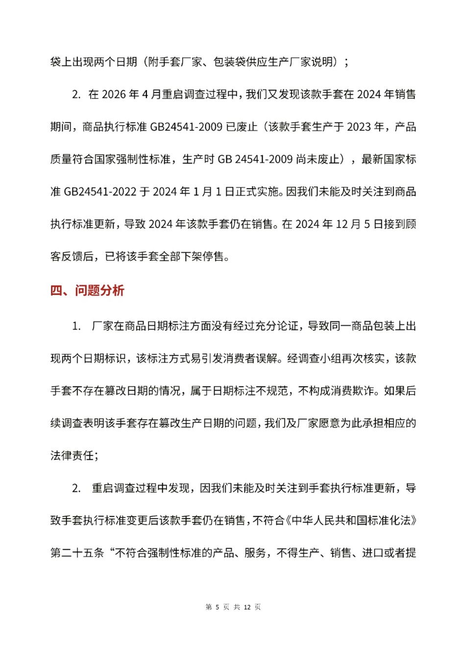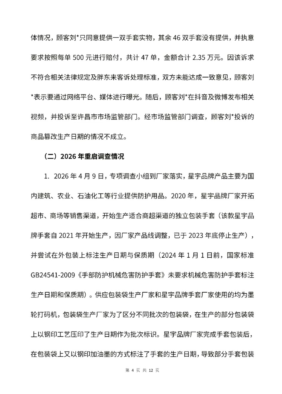 4月18日,胖东来发布《关于王海反馈胖东来销售星宇品牌“防切割手套”篡改日期指控的调查报告》。报告显示,经专项组重启调查,举报所称的篡改日期事实不成立,但该产品存在执行标准失效及日期标注不规范问题,不存在消费