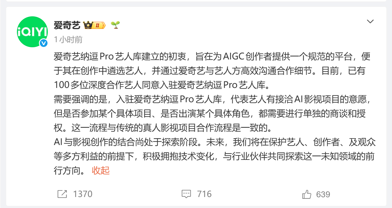 爱奇艺回应“获上百位艺人AI授权”争议
