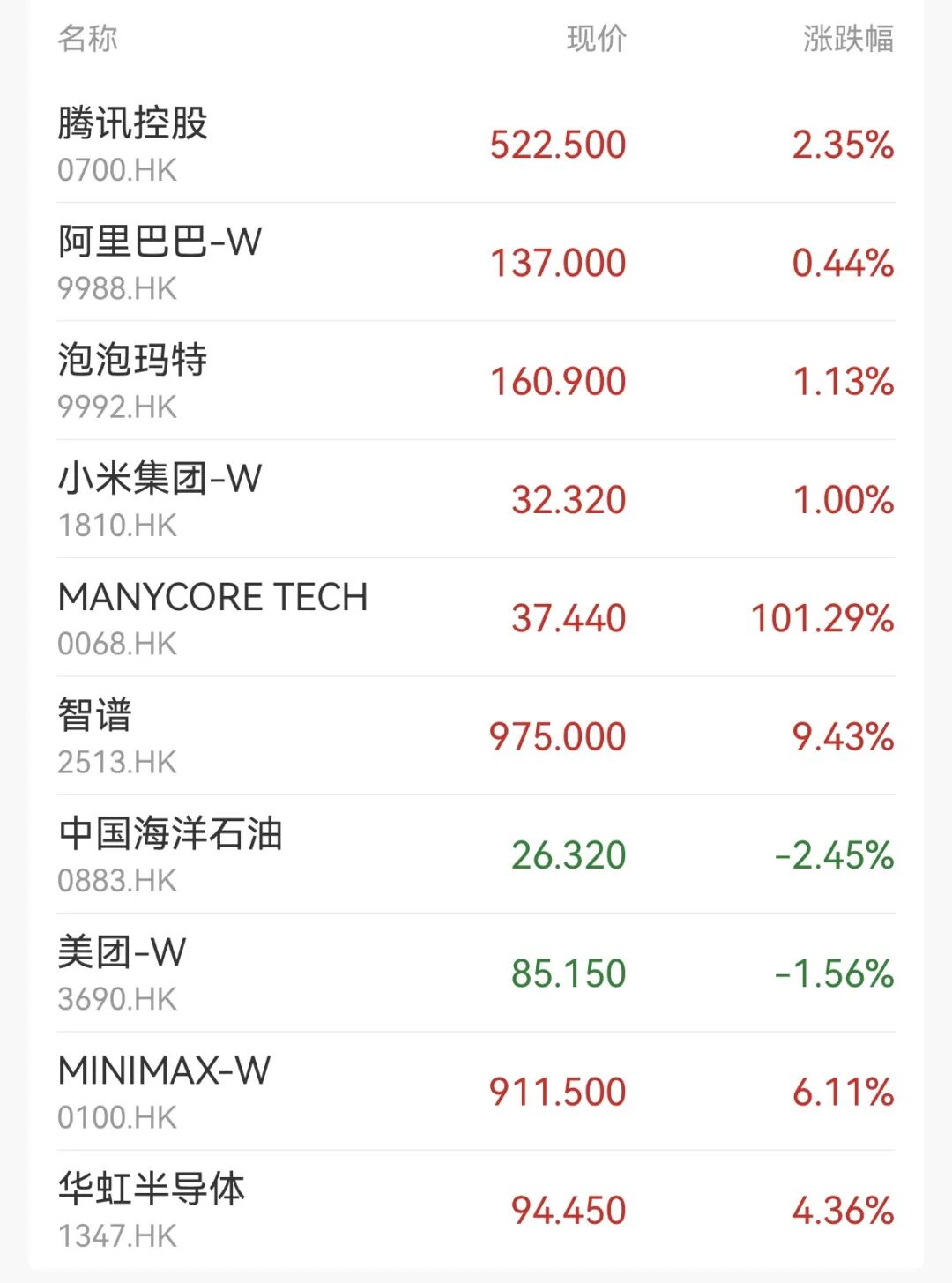 盘面上,AI应用股大爆发,成今日市场最大亮点,其中群核科技收盘大涨超101%,领涨全市场,智谱也涨超9%;大型科技股涨跌不一,腾讯控股收涨超2%,快手涨超1%,美团跌超1%;航空板块强势,东方航空涨幅超过5%;光伏板块上扬,福莱特玻璃、信义光能等个股涨幅居前。