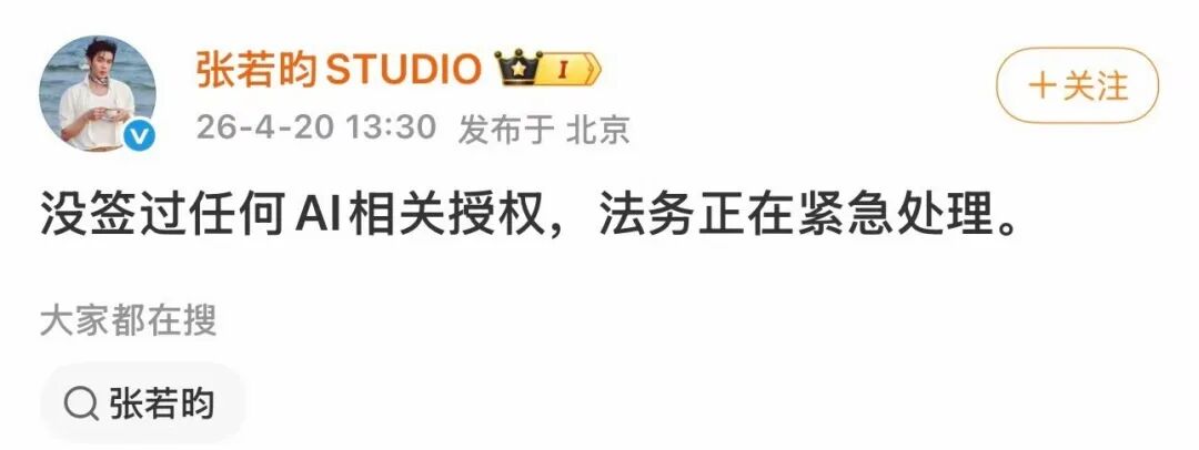 20日13:30,张若昀工作室紧急发布声明,表示没签过任何AI相关授权,“法务正在紧急处理。”