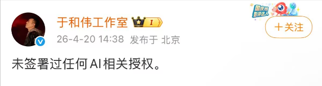 20日14:38,于和伟工作室发布简短声明:“未签署过任何AI相关授权。”
