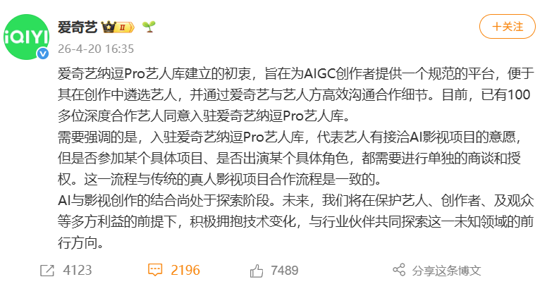爱奇艺称,需要强调的是,入驻爱奇艺纳逗Pro艺人库,代表艺人有接洽AI影视项目的意愿,但是否参加某个具体项目、是否出演某个具体角色,都需要进行单独的商谈和授权。这一流程与传统的真人影视项目合作流程是一致的。AI与影视创作的结合尚处于探索阶段。未来,将在保护艺人、创作者、及观众等多方利益的前提下,积极拥抱技术变化,与行业伙伴共同探索这一未知领域的前行方向。