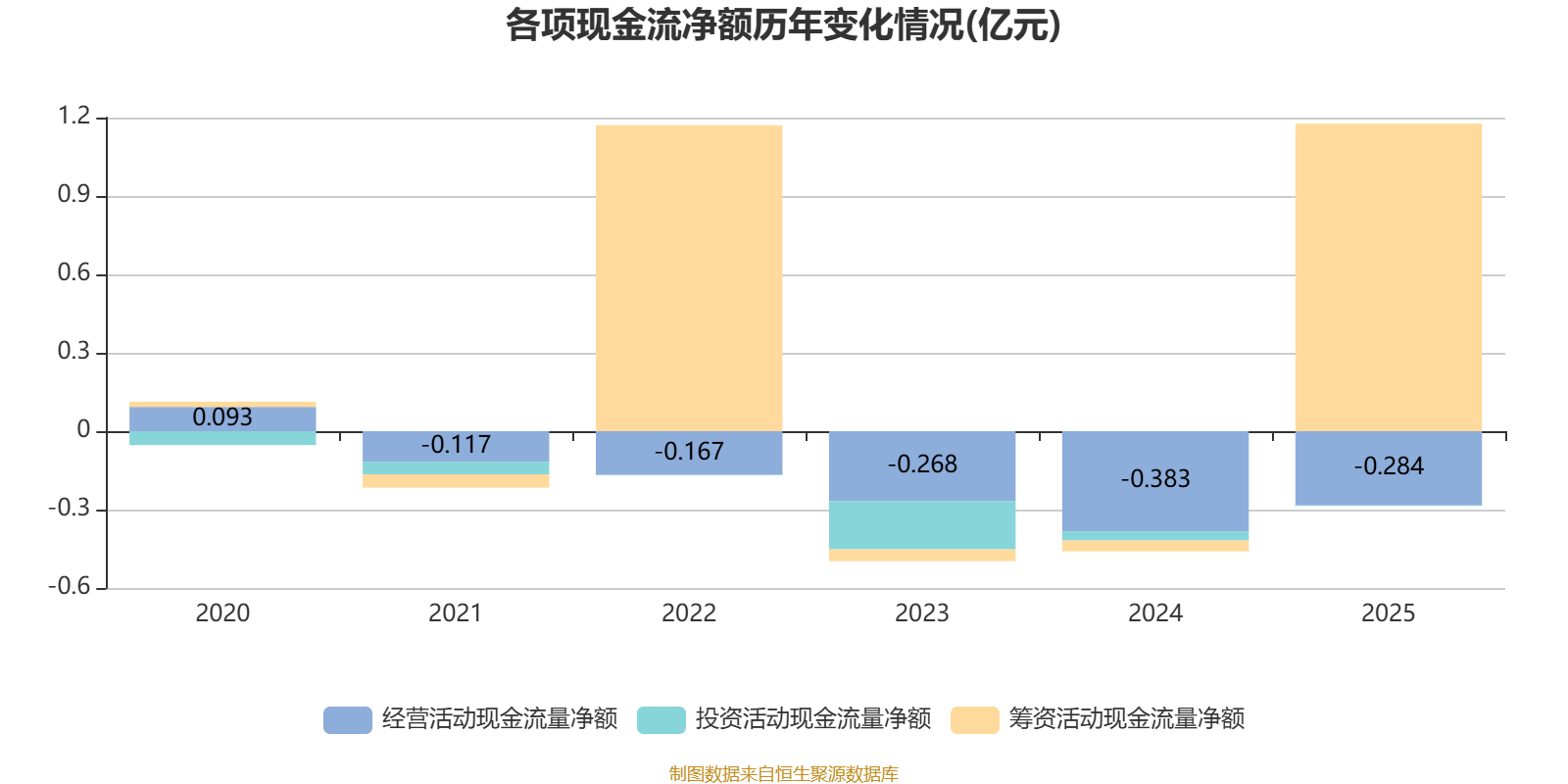 2025年,公司经营活动现金流净额为-2836.6万元,同比增加991.2万元;筹资活动现金流净额1.18亿元,同比增加1.22亿元;投资活动现金流净额-16.1万元,上年同期为-350.7万元。