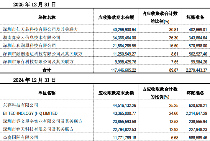 嘉合劲威的审计报告显示,截至2025年12月31日,嘉合劲威的应收账款期末余额为1.17亿元,其中深圳市和润原科技有限公司的应收账款期末余额为2156.43万元,深圳市东存科技有限公司及其关联方的应收账款期末余额为999.84万元。