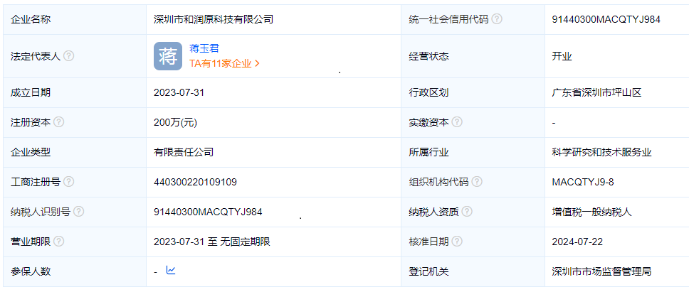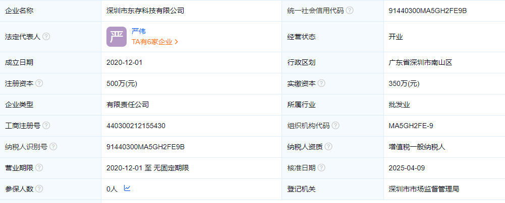 工商登记信息显示,深圳市和润原科技有限公司成立于2023年7月,注册资本为200万元,没有是否实缴资本的信息,参保人数亦未显示;深圳市东存科技有限公司成立于2020年12月,注册资本为500万元,实缴资本为350万元,参保人数为0。