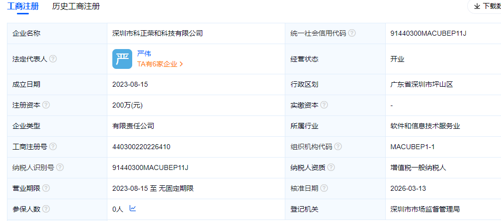 工商信息显示,深圳市科正荣和科技有限公司成立于2023年8月,注册资本为200万元,无实缴资本显示,参保人数为“0”。