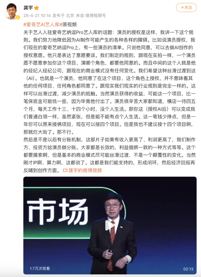 4月21日,爱奇艺CEO龚宇发文谈AI艺人库,“演员的授权是这样,我讲一下这个规则。我们努力地降低因为AI制作可能产生的各种各样的障碍。比如说演员授权,我们现在的爱奇艺纳逗Pro上,有一些演员的清单。只说他同意,可以去