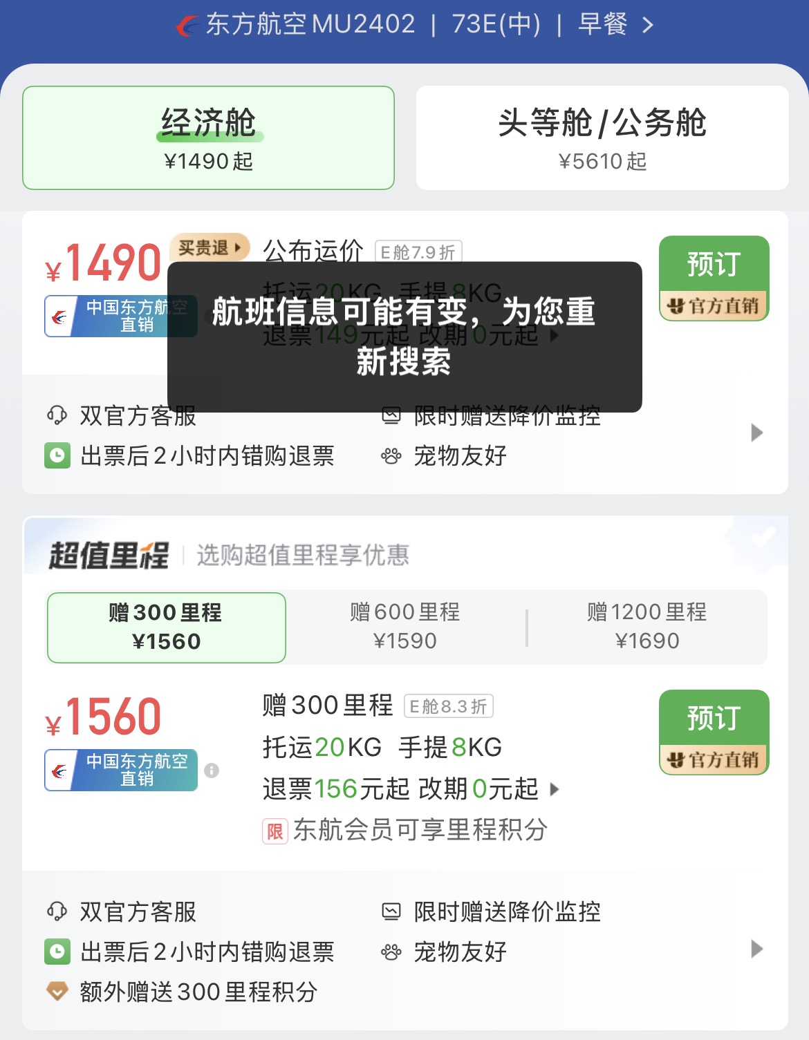 记者尝试机票预定,提交预定信息时,显示“航班信息可能有变,为您重新搜索。”尝试几次后,仍无法完成机票预定。